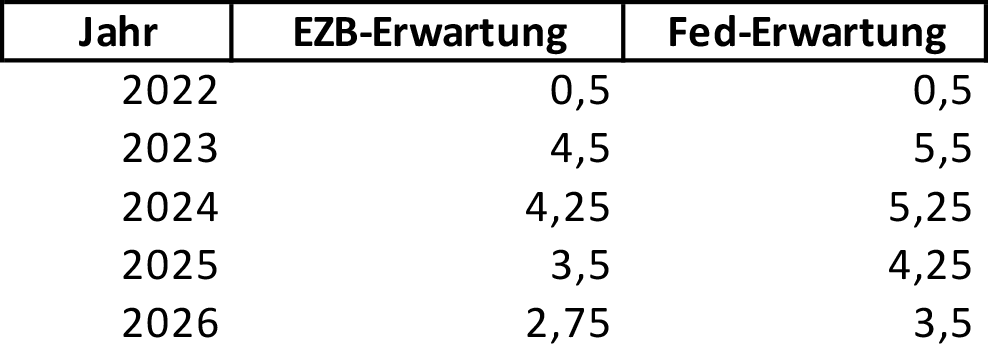 - EZB: von −0,50 % (Juni 2022) auf 4,50 % (September 2023)
