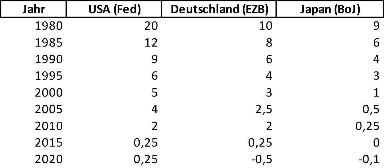 In den frühen 1980er-Jahren reagierten Zentralbanken wie die US-Notenbank Federal Reserve unter Paul Volcker auf galoppierende Inflation mit massiven Zinserhöhungen – in der Spitze über 20 %. Seither setzte – mit kurzen Unterbrechungen – ein Abwärtstrend ein, getrieben von: